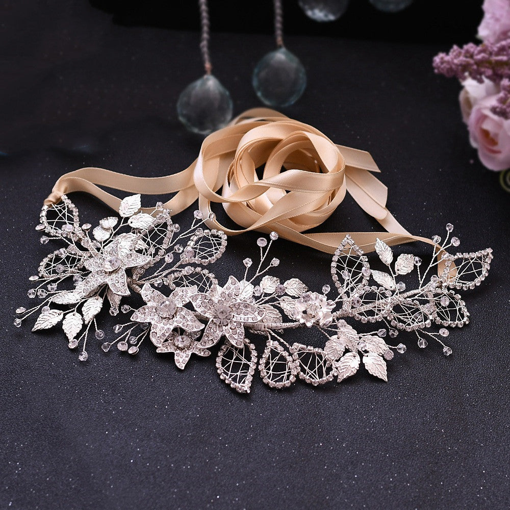This handmade waist seal belt for brides is adorned with beautiful flowers and rhinestones and comes in a variety of strap colors. The perfect accessory to add a touch of elegance and glamour to any wedding dress. Enhance your waistline and make a statement with this one-of-a-kind belt.