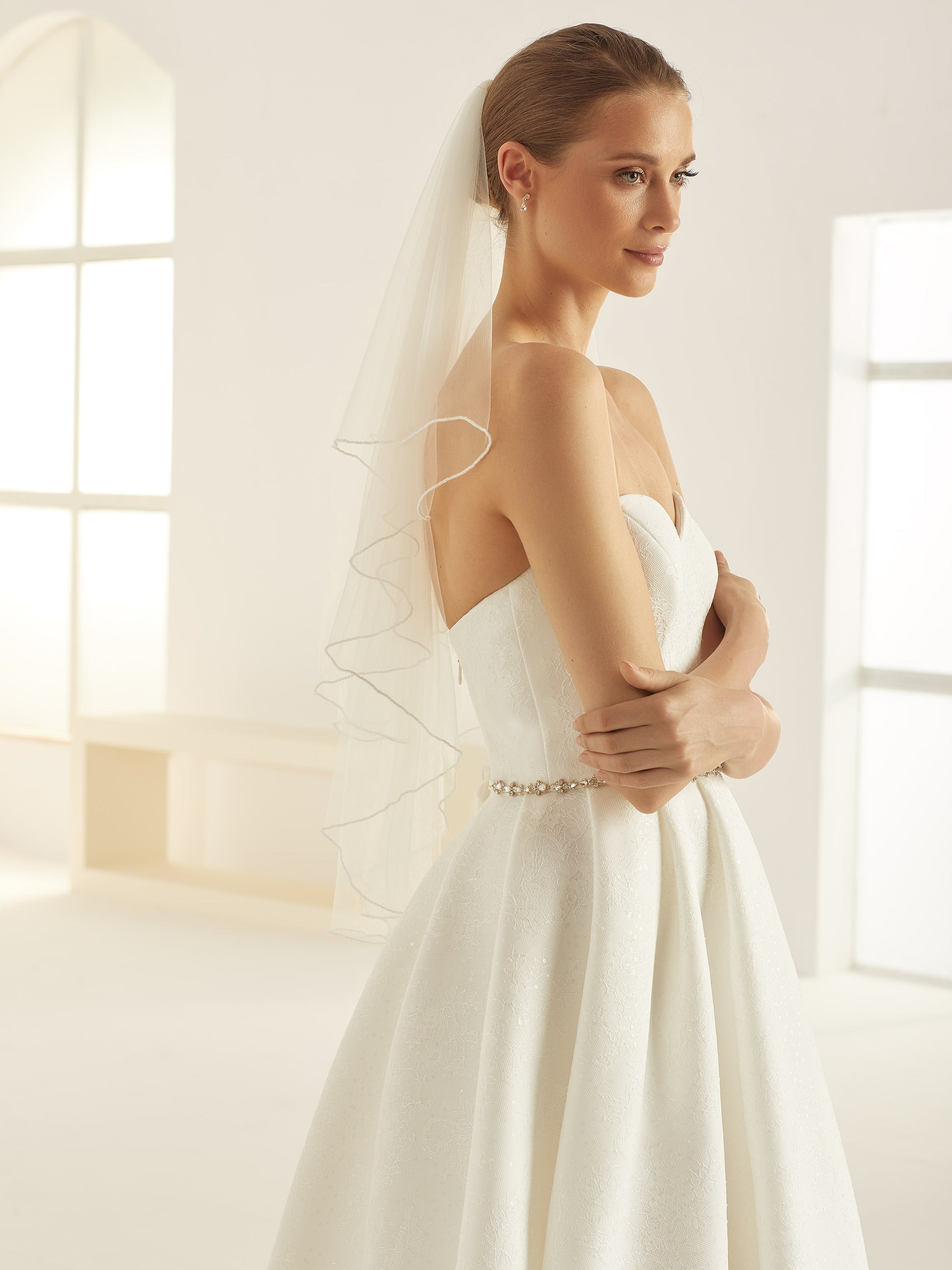 Two-layered glass beads edge soft tulle veil S312-Bianco Evento