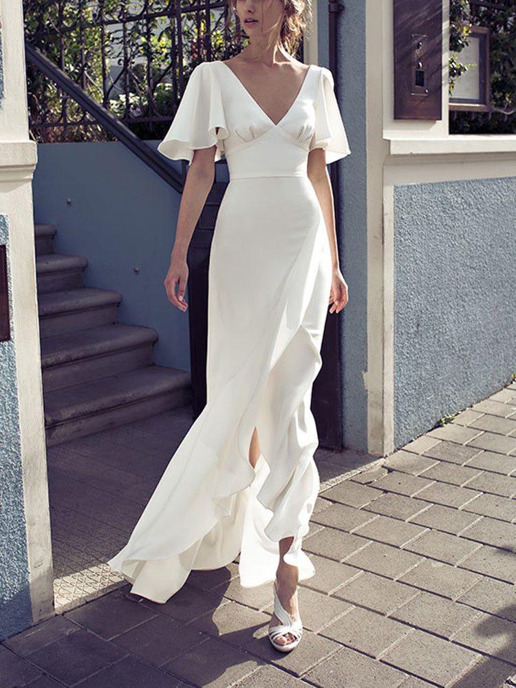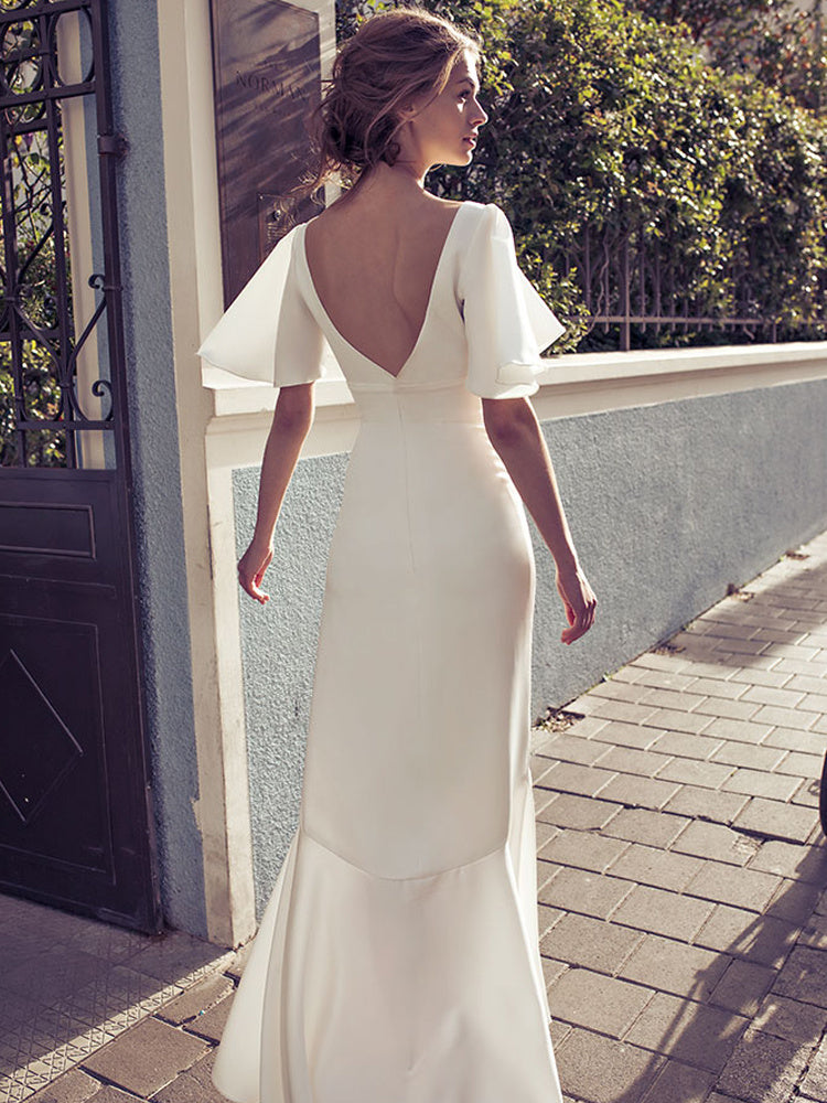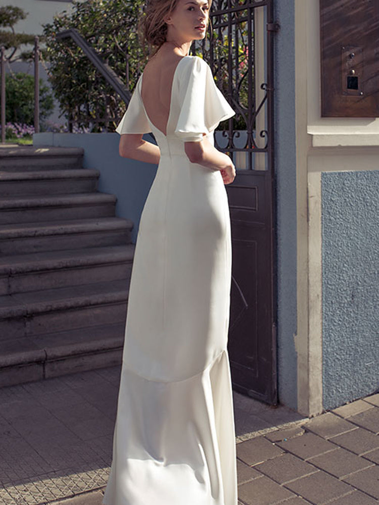 Women's Satin French White Short Sleeved Elegant Wedding Dress